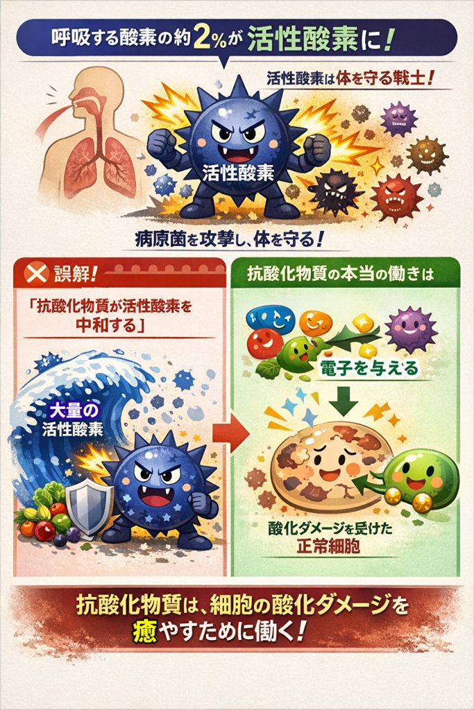 ここで、世間で流布されている大きな誤りについて一言:それは「抗酸化物質は活性酸素を中和します」というもの。この大嘘は覆す必要があります。何故なら、活性酸素は「呼吸する酸素の2%が活性酸素となって人体をガードし、病原菌を殺してくれています。」これだけの天文学的に大量の活性酸素をわずかばかりの抗酸化物質で中和することなど全く不可能です。抗酸化物質の働きは、「活性酸素の言わば勇み足である、正常細胞への酸化に対してこれに電子を与えることで、細胞の傷を癒やすことです」